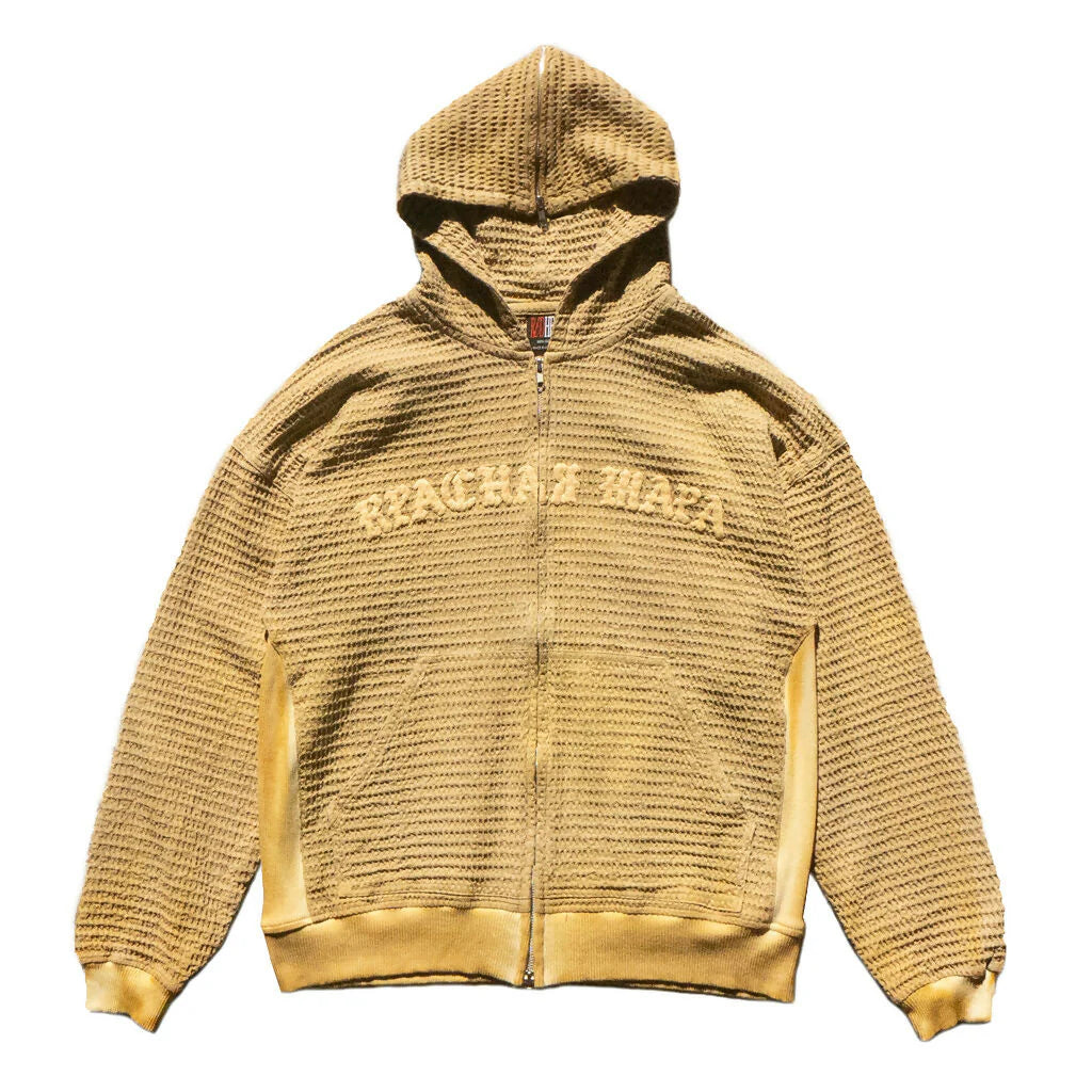 Beige pigment dyed and enzyme washed double zip hoodie.