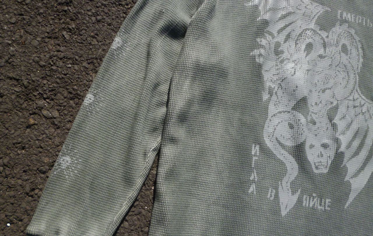 100% cotton, waffle fabric . Pigment dying, enzyme washed. Print on chest